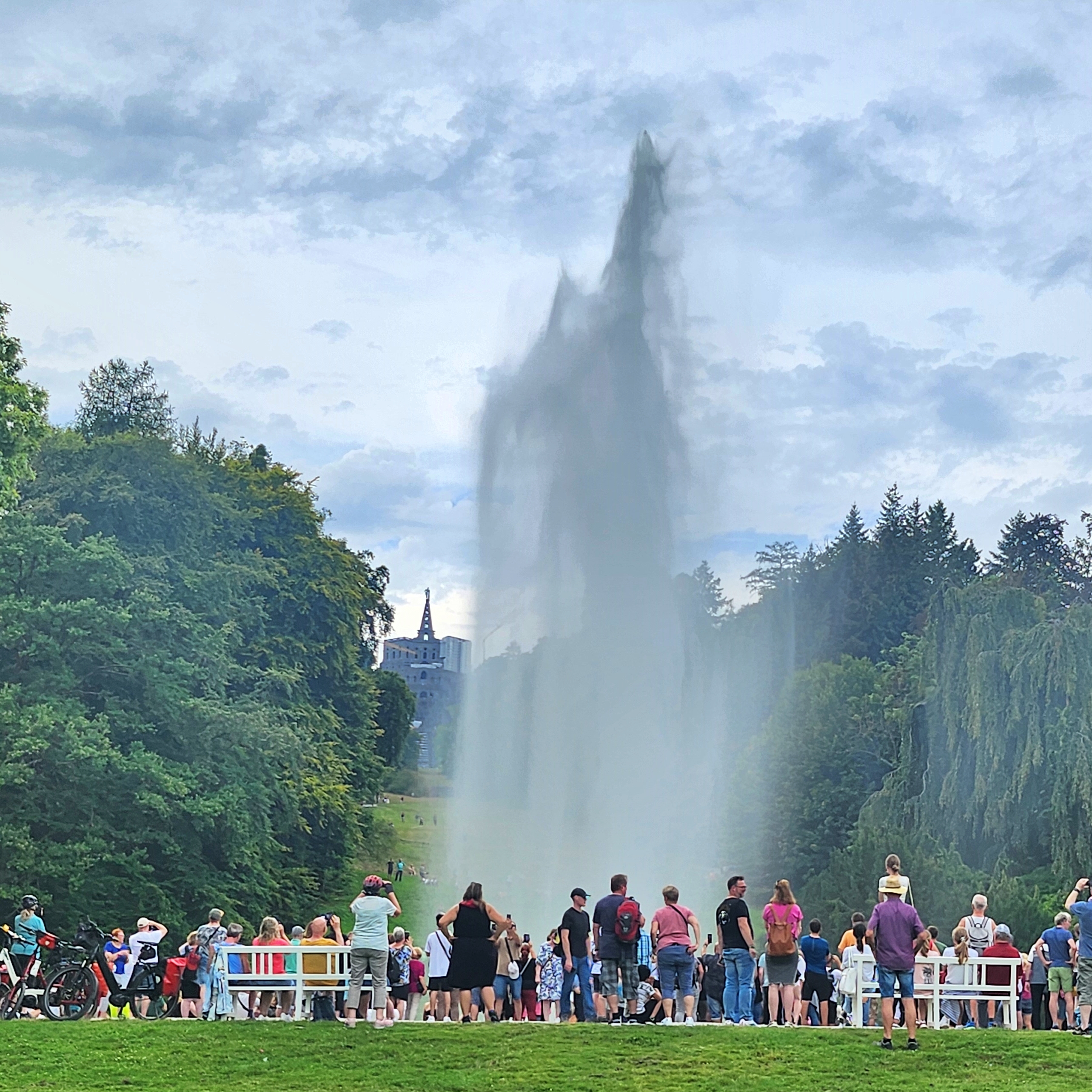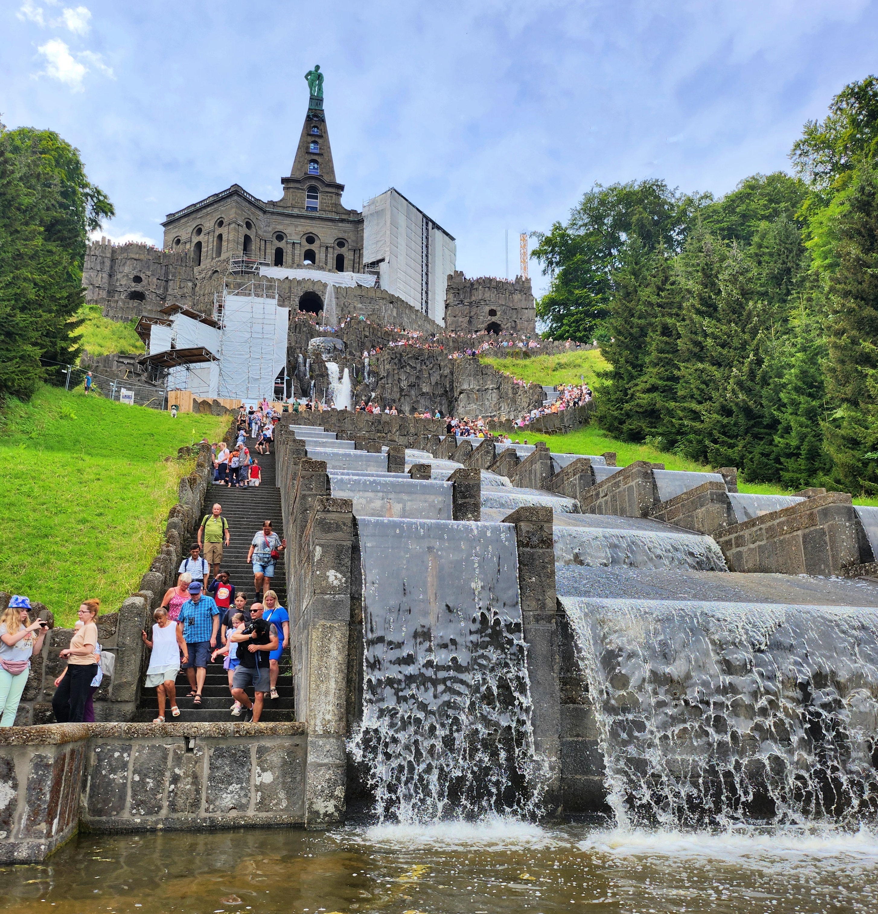 카셀에 도착하고 다음날(수요일) 4번 트램으로 종점으로 가서 버스로 갈아타고는 헤라클레스 동상 앞에 섰다. 아마도 모두들 물의 예술을 기다리는 듯하다. 자리를 깔고 점심을 먹으면서 시작하기를 기다린다.