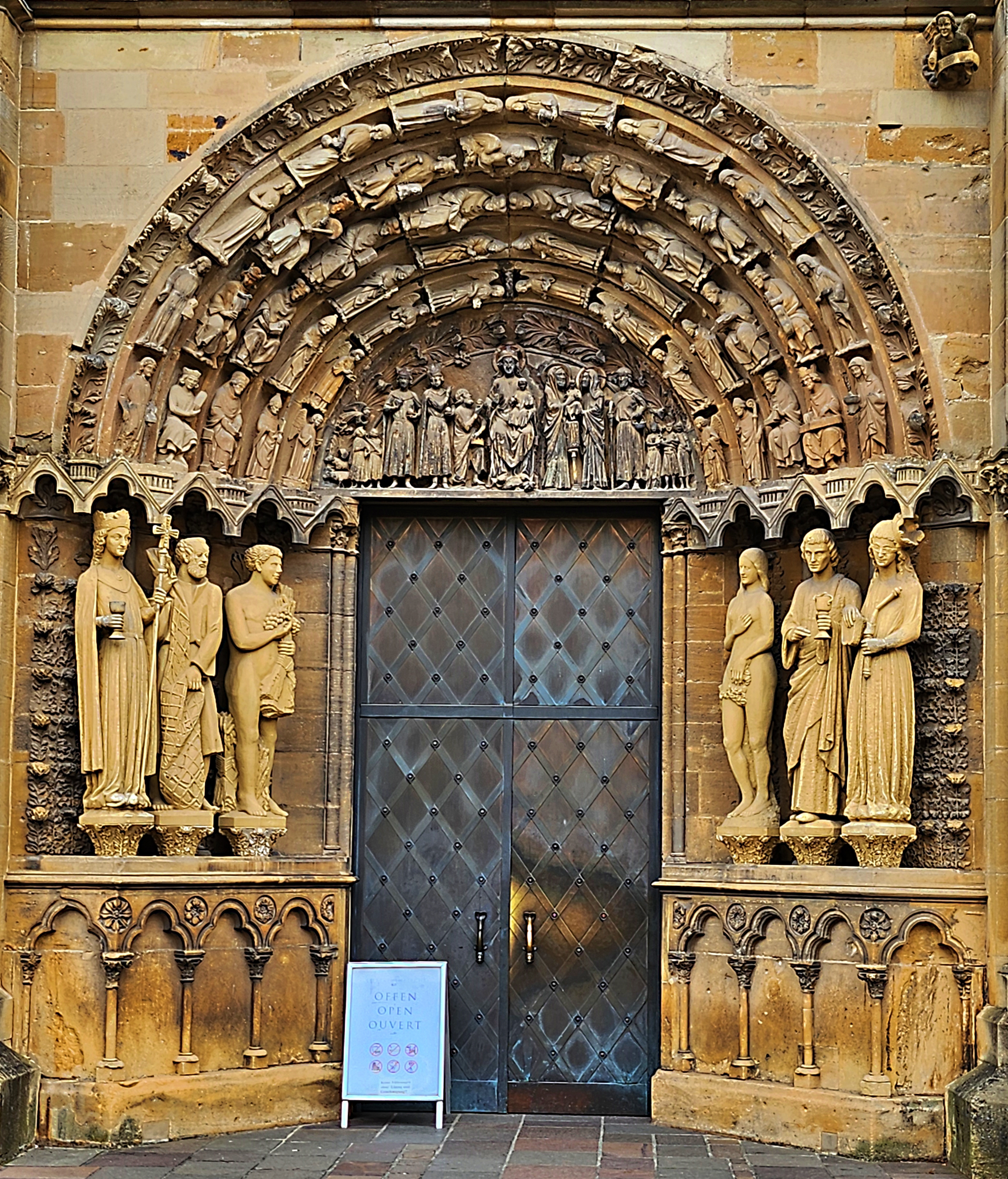 여기에서 우리가 주목해 볼만한 것은 정문에 있는 6개의 조각상이다. 누가봐도 뻔한 아담과 이브가 있다. 그믈을 들고 있는 베드로도 있다. 가장 오른쪽 인물을 보자. 관은 곧 머리에서 떨어지려하고, 눈을 가리고 손에 든 봉은 꺽여져 있다.