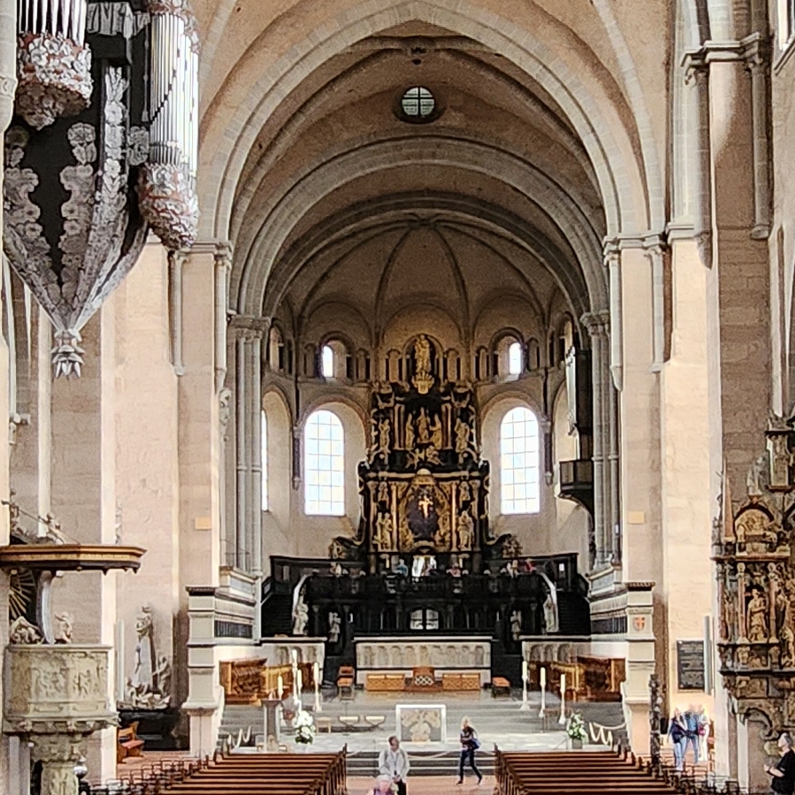 로마네스크 기둥의 흔적 뿐만 아니다. 초기에는 기둥에 인간의 두상으로 장식으로 사용하기도 했었다. 그것을 없애지 않고 남겨 두었다. 이름하여 '대성당의 유령 Domgeist'이러 불리는 사람의 머리도 찾아보자.